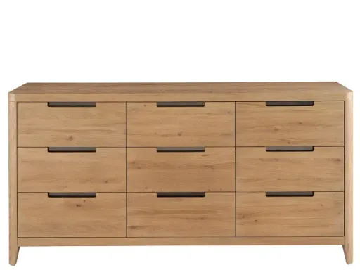 The Weston collection is a celebration of minimalist design and natural beauty. Solidly crafted, the dresser offers clean lines and a natural oak finish, enhancing its sleek yet organic feel. Its 9 soft-closing drawers provide generous storage, while sleek dark-toned metal drawer pulls lend a modern vibe.