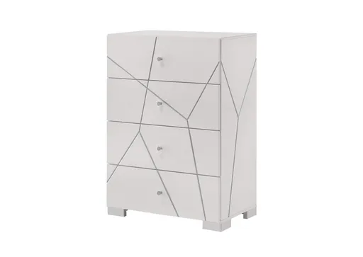 Transform your bedroom into a contemporary sanctuary with this sophisticated and stylish furniture ensemble. Defined by its bold geometric accents and pristine high-gloss white finish, this collection exudes modern elegance while maintaining a clean, minimalist aesthetic. The centerpiece bed is enhanced with a dramatic LED-lit headboard, adding ambiance and a touch of luxury to your space. Coordinated storage pieces, including a dresser, chest, and nightstands, provide ample organization while showcasing sleek hardware and clean lines. Perfect for creating a cohesive and serene atmosphere, this bedroom group offers the perfect blend of form and function, making your retreat as stunning as it is practical.