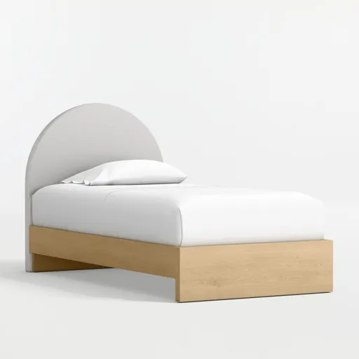 Playful, practical and perfect for the kid's room in every way. Our Emma bed features a whimsical arched headboard wrapped in softly textured upholstery to create a cushy space for reading and dreaming. Paired with a natural wood base, it's a modern, mixed-material combo that works with any decor style, at any age.