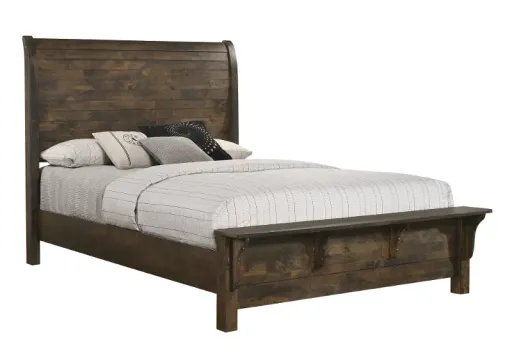 Clean-lined with rugged good looks, the Bayview collection seamlessly combines sustainability with time-honored design. The queen-size bed is crafted from reclaimed solid wood, showcasing a naturally weathered appearance with unique traits, ensuring that no two pieces are identical. A multi-step finish, which includes a rustic brown base with gray undertones and charcoal glazing, accentuates the heavily distressed look. The headboard features a subtle sleigh silhouette with horizontal slat detailing, while the footboard features a bench-inspired design that is both functional and eye-catching. Includes headboard, bench footboard, and rails.
