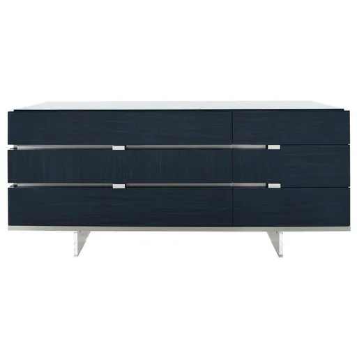 The Pacific Blue Dresser is a beautiful and unique piece of furniture that will add elegance and style to any room. It's made in Italy, exclusive to El Dorado Furniture, and features six storage drawers with brushed metal accents and fully finished interiors. The glossy finish and soft-closing drawers give the dresser a luxurious look, while the thick acrylic legs add a touch of modernity. This piece is made of melamine with multiple coats of lacquer and durable polyester.