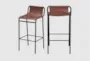 Elevate your dining or kitchen space with the Daxton Brown Vegan Leather Fabric Upholstered 33" Counterstool. Its modern design and matte black finish create a sleek look that seamlessly fits into any room. The armless feature offers unrestricted seating comfort and complements the tall, streamlined silhouette.