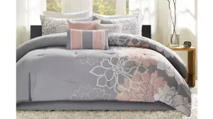 The Lola Comforter Set is the perfect update to bring beauty and grace to your bedroom. An over-scaled printed floral motif, in blush and white hues, adds a soft accent to the grey cotton sateen comforter. The solid grey reverse provides rich touch of color to complement the top of the bed. Coordinating shams with a floral motif pair beautifully with the comforter, while three decorative pillows with embroidered details and fabric manipulation complete the ensemble. For a clean finish, a solid grey bed skirt with a 15-inch drop is also included in the bedding set. Machine washable, this cotton sateen comforter refreshes your space with its casual elegance and charming allure.