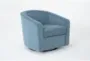The Dani Slate Blue Velvet Swivel Barrel Arm Chair brings shapely elegance to any room as a contemporary accent piece. Its generous curves wrapped in slate blue velvet fabric create a luxurious modern statement with mid-century appeal. You'll love the grounded color palette, which favors earth tones.