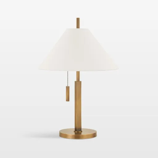 Well-tailored and timeless, the Reine table lamp is a graceful study in geometry. A round plate grounds the lamp, supporting a squared-off base that elevates the round pole. The conical white linen shade filters light softly so it gleams beautifully off the warm brass. Upright and elegant, the elegant lamp casts useful light on a desk, side table or nightstand.