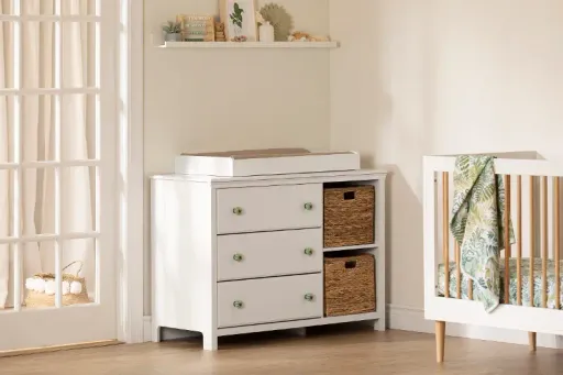 So your baby has arrived, and you don’t know if you’re coming or going? We have the solution! Three large drawers on this crisp white dresser changing table combo are ideal for storing all the clothes, diapers, and pajamas your little one will need. This piece also comes with a pair of lovely wicker baskets, which are key to giving you more storage within easy reach, while adding a bohemian look to your decor. Go bold and show off the sublime ceramic patterned handles on this piece, which will add a pop of color to the nursery while giving it a fun look. Everything will be neat and nicely put away. Keep your baby safely in place with the rimmed tabletop during diaper changes! We’ve also added space by the rim for powders, creams, and wipes so you can easily reach them without taking your eyes off the baby. This piece has also been tested according to ASTM standards to give you real peace of mind! Available for Online Purchase Only. Assembly required. This product ships direct from the manufacturer, so RC Willey Delivery is not available.