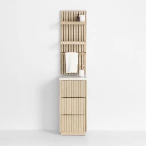 Free up space and maximize storage while elevating the look of your bath with our Batten storage collection, each piece made of beautiful oak veneer finished in white oak. A vertically slatted back panel mounts on the wall to provide a backdrop for affixing two tray-style shelves and burnished brass-finished towel rack. Clad in vertical ribbing to bring out the linear design, the storage tower is topped with a slab of gorgeous white marble. Three roomy drawers stack on the recessed plinth base, each accented with slim, horizontal pulls finished in brass to match the towel hook.