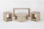 The Voyage Natural 4 Piece Coffee Table Set with 2 End & Console by Nate Berkus + Jeremiah Brent brings a modern touch to your living space. Crafted from solid hardwood and knotty white oak veneer, this set features a sun-drenched oak finish that adds warmth and style to any room. The geometric design and natural characteristics make it a standout addition to your home decor.