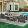 The Palermo group is a casual contemporary outdoor patio set with a tightly woven, barnwood wicker design, for a transitional look that won't go out of style. Handwoven synthetic strands of resin wicker over a powder-coated aluminum frame, each piece in this 4 piece sofa group set is built for outdoor performance. The sofa and club chairs feature gently curved arms and aluminum feet that have scratch resistant glides. The coffee table features a wicker frame with a maintenance free resin wood top. Paired with Olefin 5 in. thick foam cushions wrapped in dacron polyester for added comfort, this set is a great way to experience the ultimate comfort and style outdoors.