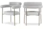 The Laki Taupe Vegan Leather Dining Armchair with Brass Leg Frame Set of 2 brings modern sophistication to your dining area. These chairs offer a comfortable seating experience with their soft boucle fabric and supportive arms. The brass leg frame adds a touch of contemporary flair to any dining room or kitchen.