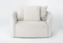 Experience ultimate comfort with the Mayes Beige White Chenille 56" Oversized Swivel Cuddler. This modern armchair is designed to provide a cozy lounging experience in your living room. The combination of polyester and linen fabric ensures durability and a soft touch.