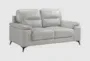 Enhance your living room with the Carmel Silver Grey 67" Leather Loveseat. This modern loveseat features a sleek design and a comfortable medium comfort level, making it a perfect addition to your living space. Made with 100% top grain leather, it offers both durability and style.