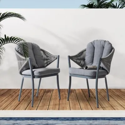 The Nuu Garden Outdoor Woven Rope Chair Set is a perfect pick for a variety of ensembles on many entertainment occasions. Leisure in style brimming with evocative charm. With a double-layer rope design and powder-coated aluminum frame, the fully assembled chairs add style without sacrificing quality. Gray seat cushions with an unexpected touch of texture are designed for comfort while adding beauty. Tufted back pillows with stitching for longevity provide further comfort options. It is the focal point of any room and is a perfect place to congregate for cocktails or even a casual breakfast or dinner.