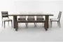 Introducing the Voyage Brown 94" Trestle Dining With Bench Upholstered + Wood Back Chair Set For 8 By Nate Berkus + Jeremiah Brent. This modern dining set features a new brown finish and is made with solid hardwood and cathedral oak veneers. Perfect for the dining room, it provides ample seating for eight guests with its included bench and upholstered chairs.