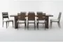 Elevate your dining experience with the Voyage Brown 94" Trestle Dining Set by Nate Berkus + Jeremiah Brent. This modern dining set includes a rectangular table and eight wood back chairs, perfect for hosting family and friends. Constructed from solid hardwood and cathedral oak veneers, this set combines durability with a sophisticated design.