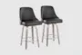 Enhance your dining room with the Marcie 26" Counter Height Stool With Swivel in Light Grey Wood and Black Faux Leather. This contemporary set of two stools features a sleek design that will complement any modern space. The chrome nailhead trim and round chrome metal footrest add a touch of sophistication.