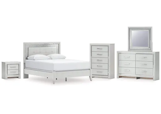 Bright, bold luxury. The Zyniden bedroom package dazzles with its attention to detail. Your love of glamorous style is reflected in its all-over faux gator in a metallic finish, exquisitely paired with faceted chrome-tone details. With its opulent approach to bedroom style, this set inspires you to live luxuriously every day.