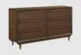 The Leno Brown Wood 6-Drawer Dresser brings a modern touch to your bedroom with its natural wood finish and walnut accents. This dresser offers ample storage space with six well-crafted drawers and additional storage doors, ensuring your bedroom stays organized and clutter-free. Perfect for any bedroom setting, the Leno Dresser combines functionality with a sleek design.