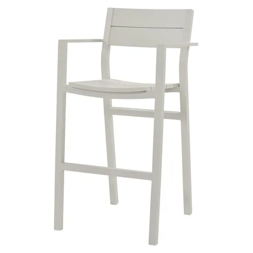 The Khronos Bar Stool is durable for your bar area in your patio with strong daisy white powder coated aluminum construction. The plank style accents on the seat and backrest of this tall stool complete the simple modern look.