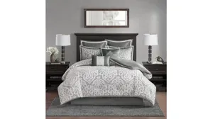 Add a touch of class to your bedroom with the Odette King 8 Pc.Comforter Set. The luxurious textured comforter and shams flaunt a gorgeous damask medallion design with silver striations on the satin ground that add dimension to the lavish look. A solid grey reverse and stunning shams complement the top of the bed to complete the ensemble. Also included are two decorative pillows that feature embroidery and cording details, while a solid silver bed skirt provides a clean and elegant finish. Overfilled for superior warmth and comfort, thiscomforter set offers a strikingly luxurious update to your d_cor.