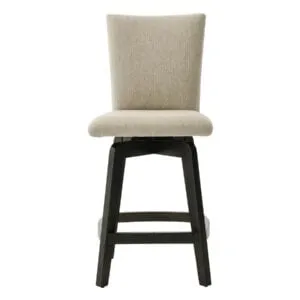This counter stool features a padded back rest and 180-degree swivel seat upholstered in a beige woven fabric with tan, dark brown, and medallion yellow undertones, with a wooden frame crafted of solid rustic cherry wood in a mocha-colored finish.