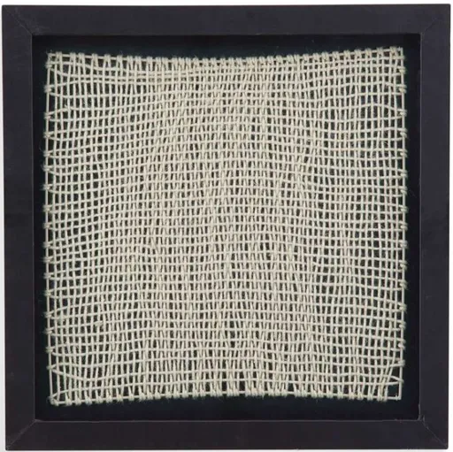 Woven wall art is uniquely crafted piece of art featuring woven jute in a geometric pattern framed in a shadow box under glass in a black frame. This piece of art is hand-painted by a skilled artist lending itself to a unique technique and will vary slightly.
