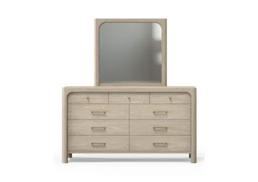 With its broad frame and softened curves, this dresser and mirror set radiates quiet confidence and poise. Sculpted edges flow gracefully around nine generous drawers, while the tall mirror reflects light and space with understated beauty. A hidden jewelry tray in the top drawer adds a thoughtful touch of luxury. Designed to bring harmony and order, this piece is both a centerpiece and a sanctuary for daily rituals.