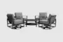 The Prospect Outdoor 5 Piece Swivel Lounge Chair Conversation Set is a modern, grey ensemble made of durable metal and dolomite. This set includes four swivel glider chairs with removable cushions and a round conversation table, all designed with weather-resistant upholstery for outdoor use. This patio piece will elevate your outdoor space.