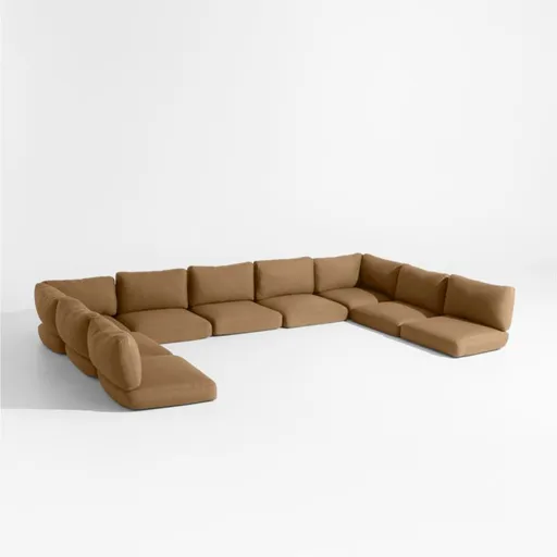 Our Andorra outdoor seven-piece sectional owes its coastal cool vibe to fine workmanship and contemporary lines. Combining two corners and three armless chairs with left- and right-arm sofas, the U-shaped sectional features mahogany frames and wide-slatted backrests made of bentwood eucalyptus. Flaring arms, angled back legs and pointed corners that resemble the bow of a ship make this a sofa that looks good at any angle. Wire-brushing and a grey-brown finish replicate the look of sea-weathered wood, while weather-resistant white seat and back cushions add an extra layer of stay-awhile comfort.
