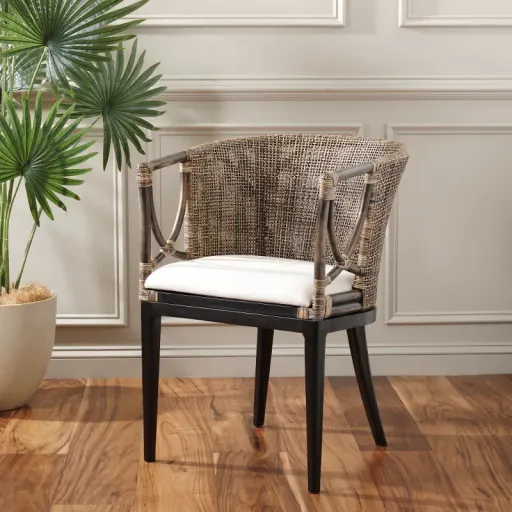 Inspired by the aesthetic melange of Buenos Aires at the peak of modernity, the Beningo Arm Chair with white cotton cushion is pure sculpture. Its exquisite rattan back with classic arm detail is accented with rugged rawhide and black mahogany legs. Available for Online Purchase Only. Ships Directly from the Manufacturer. RC Willey Delivery is Not Available. Assembly required.
