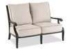 The Turin Collection features a distinctive style in a reddish-brown color frame that creates a clean and inviting presence in your outdoor patio space. This loveseat is made with an extruded aluminum frame with cast aluminum accents and features a hand-applied antique finish, bringing out the detail in the frame. The mid-modern design of the sofa features hammer-forged style arms and a nailhead windowpane back, giving a unique flair to your outdoor space. The high-back Charlotte Sparrow Sunbrella® cushions possess a unique texture with flecks of brown and grey within a cream ground and contrasting rope braided welt. Designed to seat 2 comfortably, settle into the ultra-plush cushions set upon sling suspension for extra comfort.