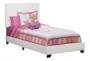 Introducing the Emily White Twin Faux Leather Upholstered Panel Bed, a perfect blend of modern and contemporary styles. This twin bed features a super soft, white leather-look material with a simplistic headboard design, making it a stylish addition to any bedroom. The low profile format of this platform bed frame ensures easy access, while the black block-style plastic legs provide sturdy support.