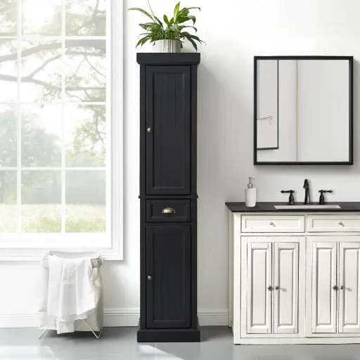 Bringing stylish organization to any room, the Seaside Tall Linen Cabinet features a slender profile perfect for small spaces. Both cabinets feature doors with beadboard paneling for a classic coastal look and open to reveal two adjustable shelves. A full-extension drawer sits in between the cabinets, adding storage for smaller items. With its functional versatility, Seaside Tall Linen Cabinet can be used as a bookcase for your office or as a beautiful kitchen pantry. Available for Online Purchase Only. Ships Directly from the Manufacturer. RC Willey Delivery is Not Available. Assembly required.