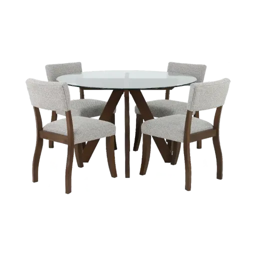The Wade collection will add time-honored beauty and effortless style to your home! This 5-piece dining set comfortably seats four and will elevate your mealtime gatherings with its sleek form and function. The dining table features a 48 round glass top and a hearty timber-beam base finished in a multi-step mocha brown finish is handsomely displayed beneath the glass top. The side chair offers chic comfort with its textured boucle fabric, plush foam padding on the seat and backrest, and gently flowing lines. Includes 48 round dining table and 4 side chairs.