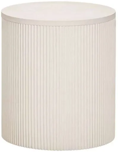 The Lena End Table embodies a modern aesthetic with its round shape and sleek design. Crafted from cerused white oak veneers in a driftwood finish, it features elegant reeded accents in a faux plaster finish. This combination of textures adds a sophisticated touch to any room.