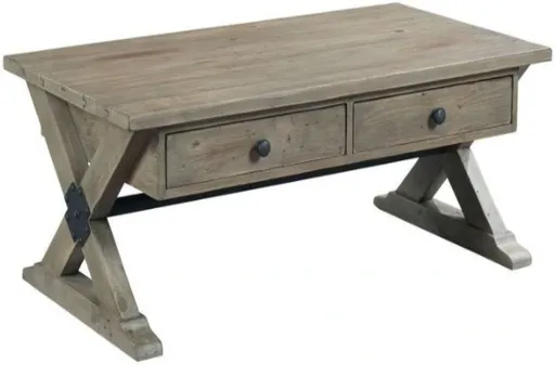 Reclamation Place cocktail table is crafted of reclaimed woods with sun-dried natural, willowed or sundried natural, rustica and rubbed charcoal, water-based finishes are environmentally friendly. Reclamation Place holds true to the style by combining wood and metal components mixed with a combination of old and new designs.