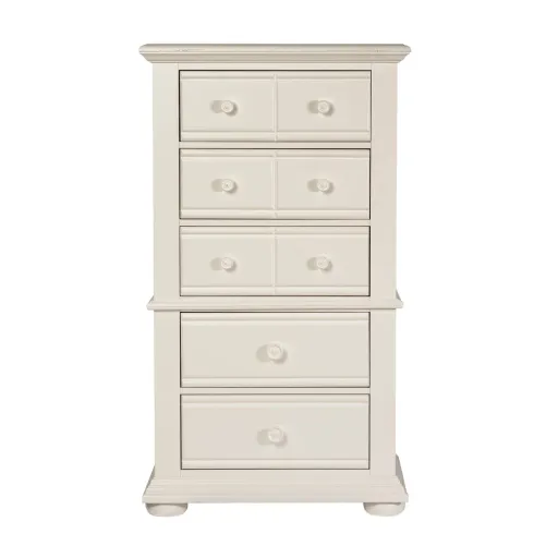 Lighten up any bedroom with the Summer House lingerie chest where all the best elements of cottage design are captured in a single piece. Crafted with poplar and pine solids, this chest features bottom case dust proofing, felt lined top drawers, and fully stained interior drawers. The oyster white finish accompanied by wooden knob hardware offers an unmatched cottage feel to any space.