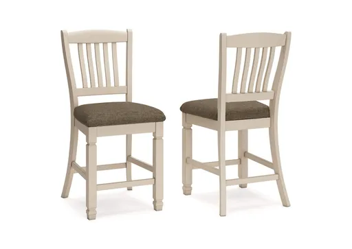 The beauty of the Bolanburg upholstered bar stool is something to savor. Designed to serve up comfort and flair, this rake-back bar stool entices with a cushioned seat covered in a heavy woven fabric that complements the antiqued white finish.