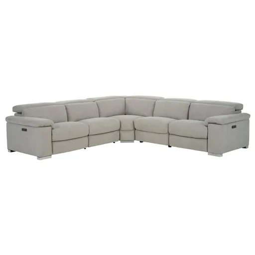 Cozy. Comfy. Chic. Classy. We could go on and on, but we'd waste time you could be spending on the Karly Light Gray Power Reclining Sectional with 5PCS/2PWR. This sophisticated modular sofa features power motion in the headrests and the left and right recliners. All the high-tech lovers will enjoy its built-in USB-A ports and battery pack compatibility. And those who look for style will be impressed by its baseball stitching, knife-edge padded armrests, and block-style chrome legs.