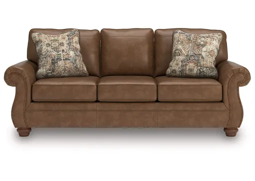 Everyone can have the best seat in the house with this sofa. Its nailhead trim puts the finishing touches on the traditional roll arms you love. Comfy, durable cushions—wrapped in a rustic yet sophisticated faux leather—keep you feeling relaxed. Chenille pillows in a distressed motif pattern add another layer of comfort. And the sofa's turned legs show that style and quality flow from top to bottom.