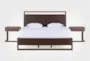 Transform your bedroom with the Sawyer Brown Walnut California King Upholstered & Wood Platform Bedroom Set from The Essentials. This modern set combines medium walnut wood with faux leather, creating a harmonious blend of materials. The platform design ensures a sturdy foundation, while integrated LED lights and USB ports add convenience and functionality.