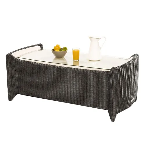 The Luxor Brown Coffee Table is designed with wicker, weather-proofing this piece for greater durability. A tempered glass top is inserted above its white leatherette surface, creating a combination that will look absolutely beautiful in the outdoors.