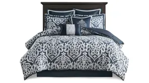 Add a touch of class to your bedroom with the Odette king 8-pc. comforter set. The luxurious textured jacquard comforter and shams flaunt a gorgeous damask medallion design with silver striations on the satin ground that add dimension to the lavish look. A solid navy reverse and stunning Euro shams complement the top of the bed to complete the ensemble. Also included are two Decorative pillows that feature embroidery and cording details, while a solid navy bed skirt provides a clean and elegant finish. Overfilled for superior warmth and comfort, this jacquard comforter set offers a strikingly luxurious update to your decor.
