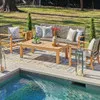 The Hampton collection offers a blend of materials in a contemporary look that adds warmth and substance to your space. The sofa and club chairs feature a neutral shade of resin wicker strands over a solid teak frame. The seating is fully assembled and cross braced to provide extra support. The weave pattern allows air to flow through, keeping you cool while you lounge outside. The coffee table is composed of solid teak and has a fine, sanded finish with a slat-top design. Each piece is a combination of machine-made for precision and handmade with traditional Mortise and Tenon construction for smooth and tight joinery.