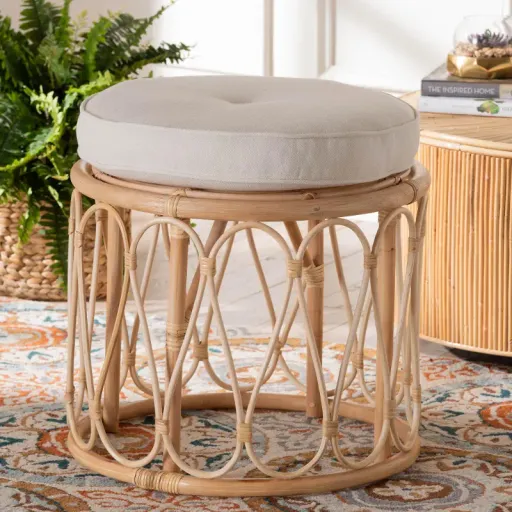 Handcrafted by skilled artisans, the Hachiro Light Brown and White Ottoman Footstool invites the look of natural elegance into your home. Topped with a removable cushion, the round silhouette displays a curled rattan design that looks beautiful from every angle. This can serve as extra seating for friends and family who have come to visit, or as a comfortable place to put your feet up at the end of a long day. Available for Online Purchase Only. Ships Directly from the Manufacturer. RC Willey Delivery is Not Available. Assembly required.