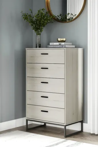 Light and bright, this chest of drawers is inspired by chic design. A light natural finish over replicated oak grain offers an authentic touch to this so-cool piece. It beautifully blends the hues of natural living with the edginess of your modern lifestyle. Available for Online Purchase Only. Ships Directly from the Manufacturer. RC Willey Delivery is Not Available. Assembly required.