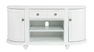 Build your family room around the delicate touches and lovely look of this Rothbury Tv/Media Stand. Truncated corners create a rounded edge where two, ornate side cabinets offer shelf storage for movies, games, or anything to be tucked away. Two broad media shelves conveniently house electronics and media equipment while one wide, single drawer features an exquisite faux double-drawer trim.