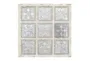 This metal and wood wall plaque can significantly improve your rustic style space when mounted on walls. This item ships in 1 carton. The frame color is a creamy light beige with distressed markings revealing raw wood beneath it Soft brown brush strokes bring out the shadows in the iron plaques. Can be hung vertically using the D-rings on the back; nails and screws not included. Suitable for indoor use only. This item ships fully assembled in one piece. This is a single white colored wall sculptures. Rustic style.