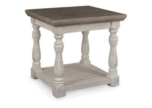 With its richly rustic finish and textural mix, the Havalance end table goes to town on bygone beauty. Its distressed two-tone treatment blends a weathered gray with vintage white for an utterly charming effect. Robust legs lend a hearty, substantial look that feels right at home.