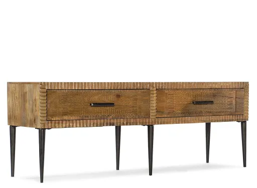 Display your TV in organic elegance with the Commerce & Market 2-Drawer Entertainment Console, crafted with mango solids and featuring two carved-front drawers and slender, textured iron legs and bar pulls in a charcoal finish.